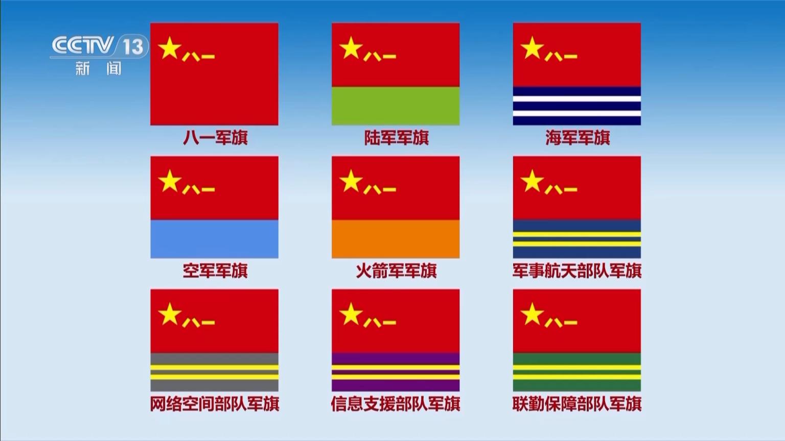 陆军军旗草绿色,象征绿色的大地;海军军旗蓝白条相间,象征大海与海浪;空军军旗天蓝色,象征辽阔的蓝天;火箭军军旗橙黄色,象征导弹点火腾飞时喷出的烈焰——4面军种军旗,风格简洁、大气庄重。